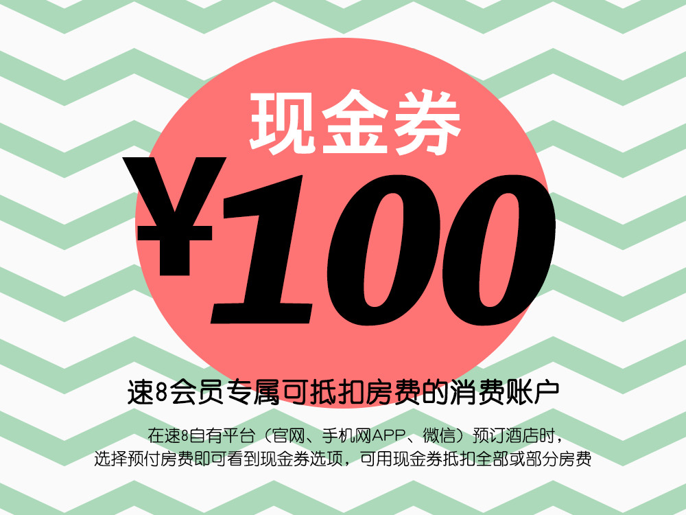 2、通过速8官网/速8微信公众账号/手机网预订带有“现金券抵付”字样的酒店,预付房费时均可使用现金券;